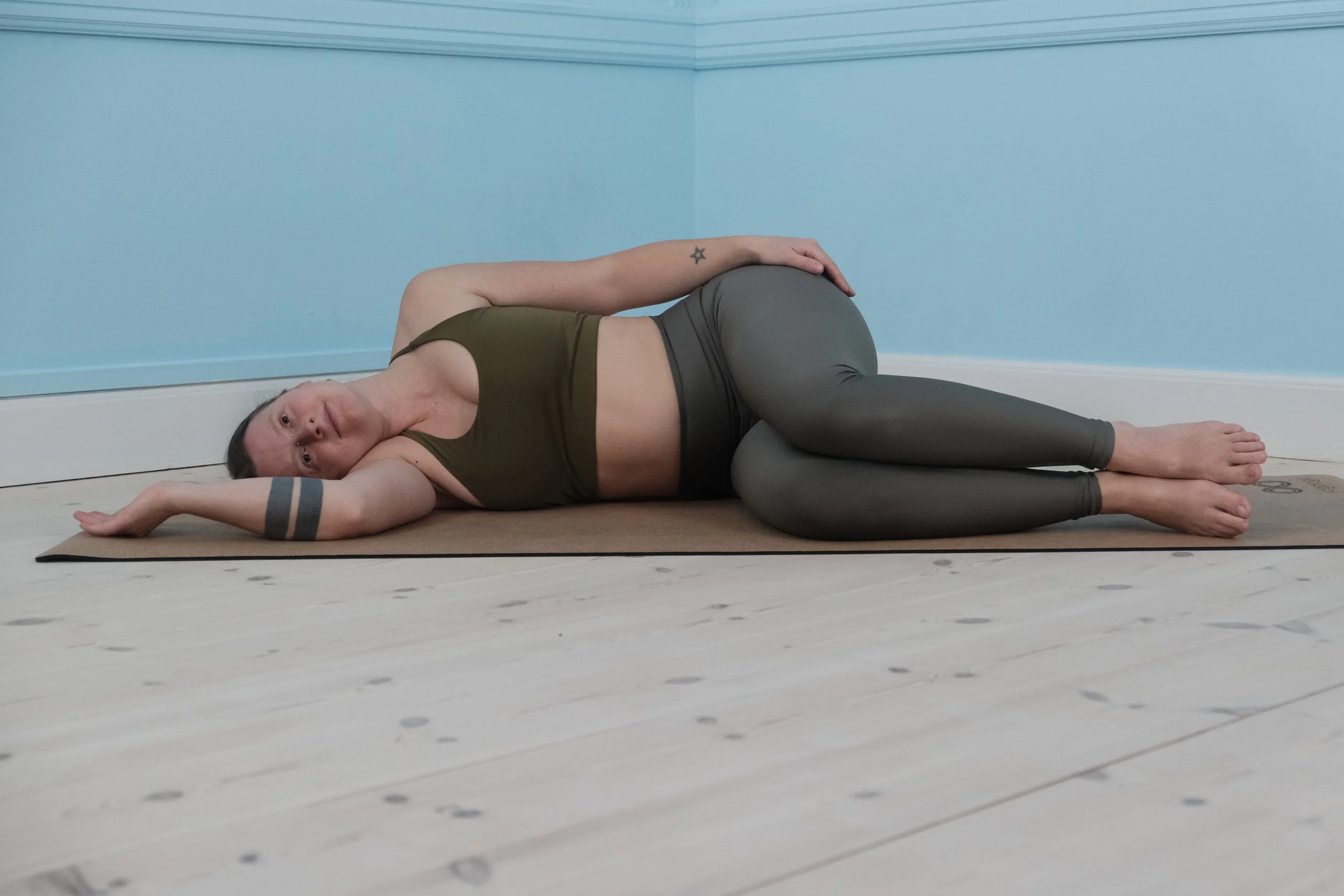 Læg dig på siden. Tindingen hviler mod underlaget. Armen er trukket frem, så skulder og albue ligger i 90 grader. Bøj på samme måde i hoften, så knæet kommer op mod maven.