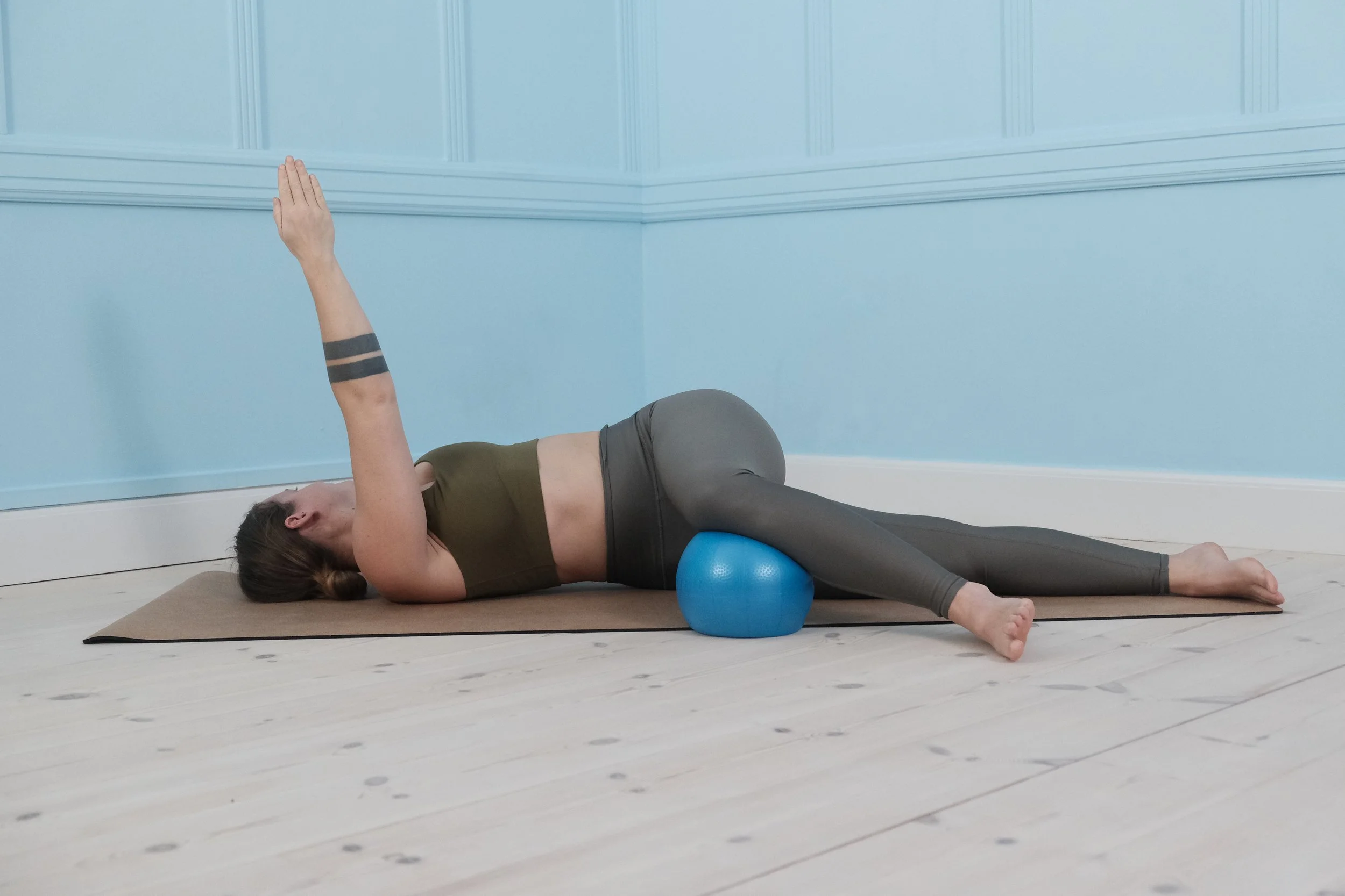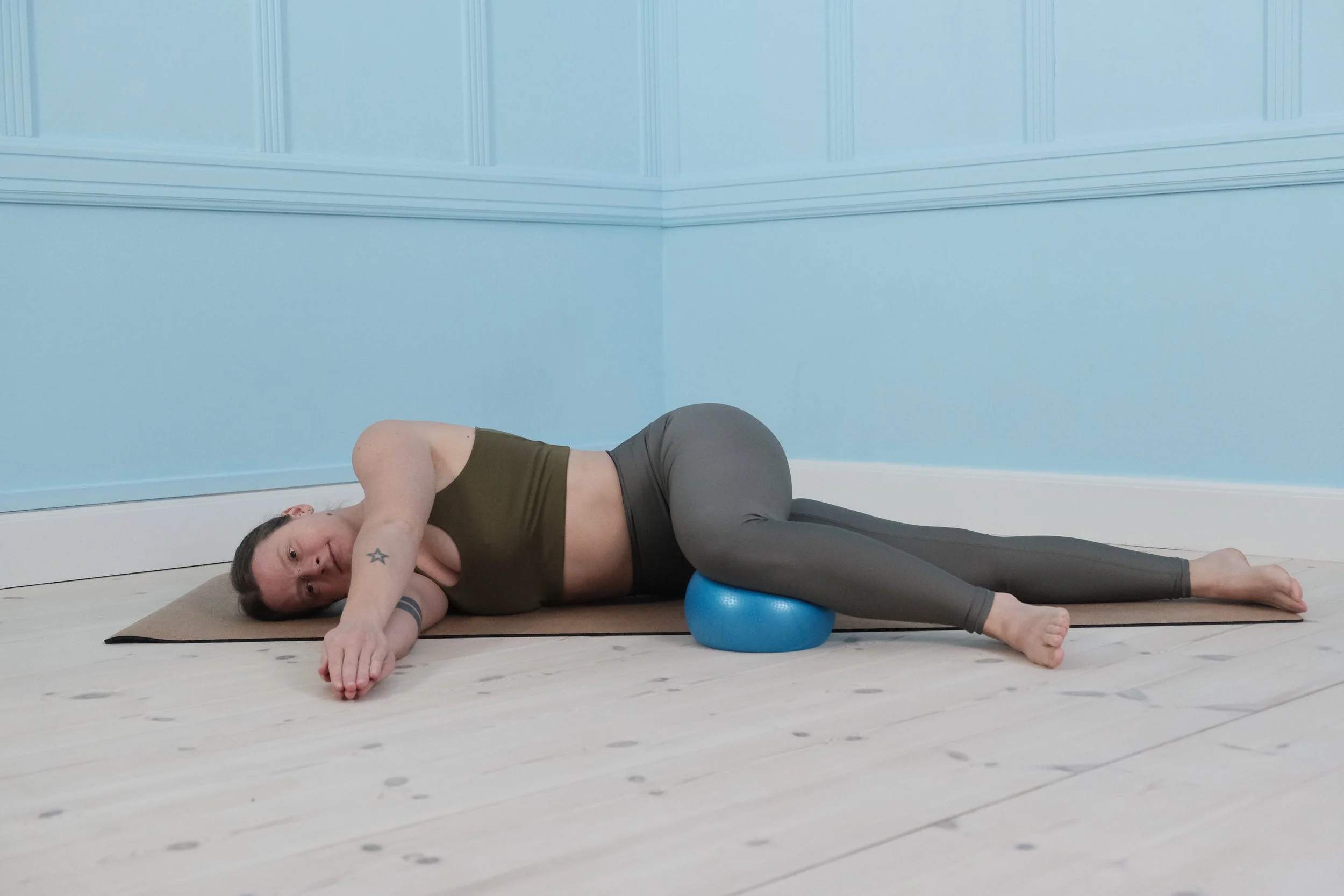 Udgangsstillingen er den samme, men du tager den bløde bold og lægger den mellem taljen og armhulen, så skulderen stadig kan hvile på underlaget.