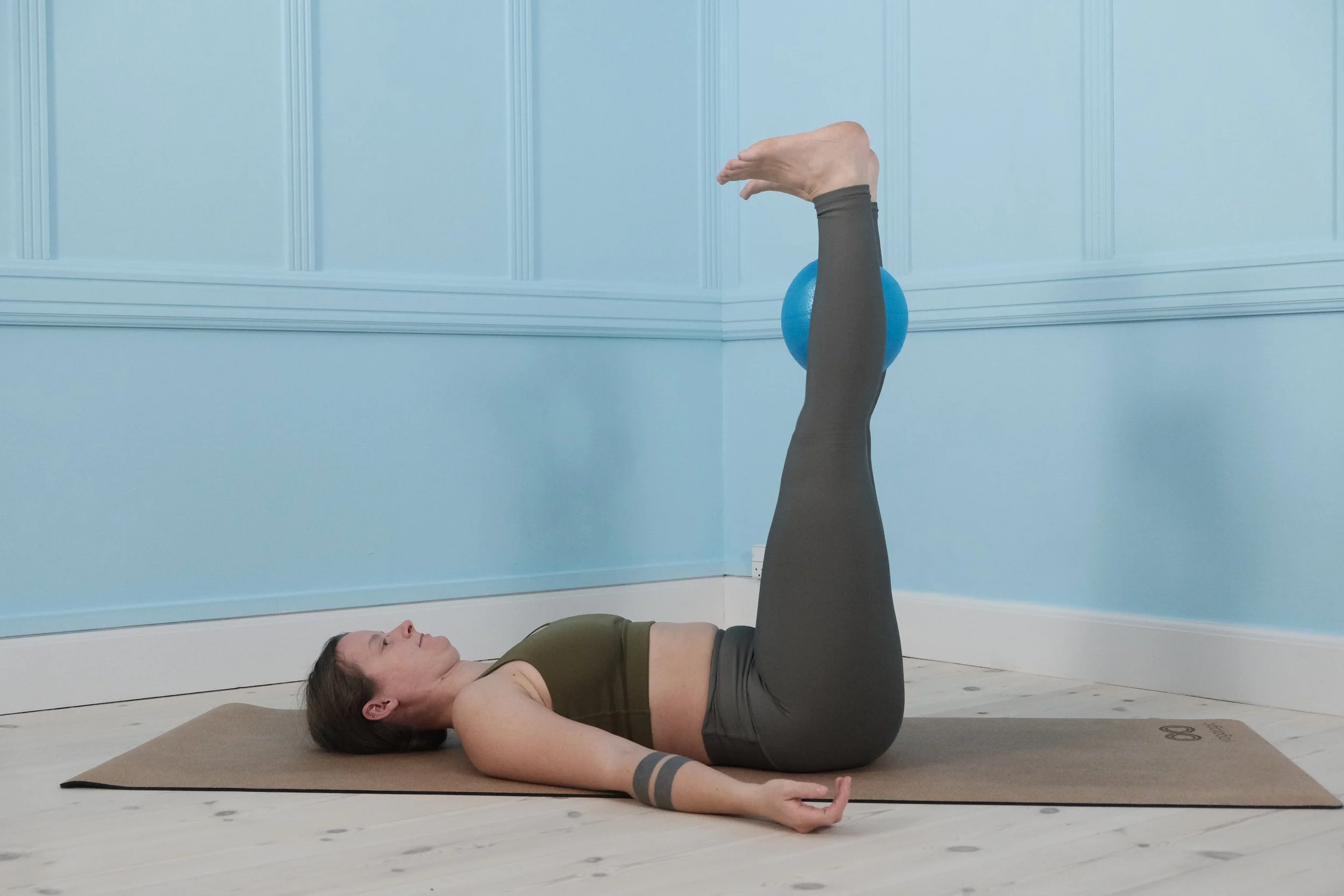På udåndingen strækker du benene, fører fødderne mod løftet og trækker træerne mod dig uden at tabe bolden mellem benene.