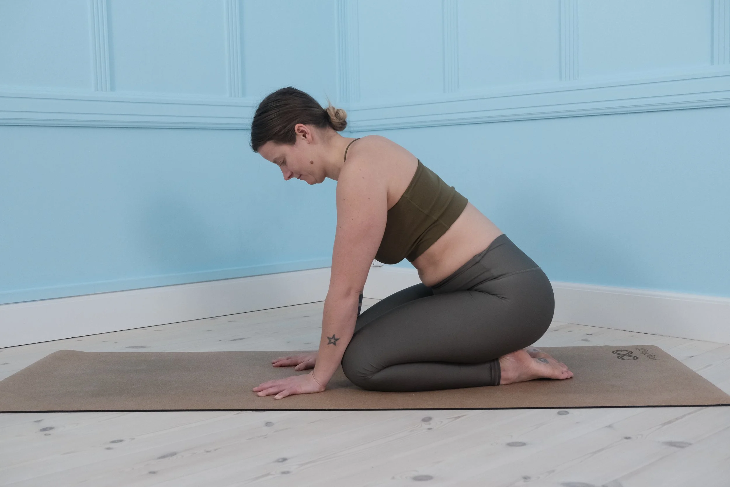 Prøv at sætte dig helt tilbage på hælene. Hvis du ikke kan sidde helt ned, kan du lægge et par puder ind mellem fødder og balder, så du sidder ned. Sæt hænderne foran knæene.